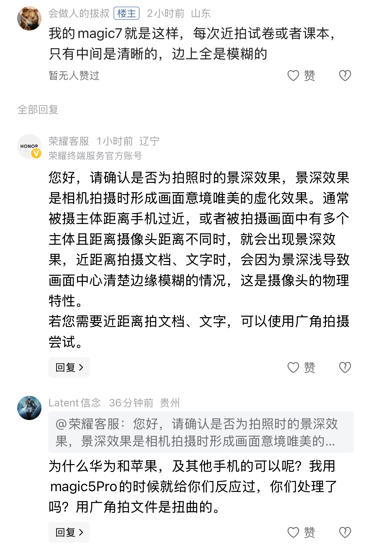 同样场景下我也试了其他品牌手机拍摄,并无类似问题,暂不清楚是大光圈的硬件问题还是荣耀算法不行。在社交平台,也有一些网友反馈自己的荣耀手机存在类似情况,导致拍文档不能全部内容拍清晰。耐人寻味的是,有荣耀终端认证的荣耀客服在社交平台表示,“这是摄像头的物理特性”、“景深效果”、“可以使用广角镜头拍摄”。