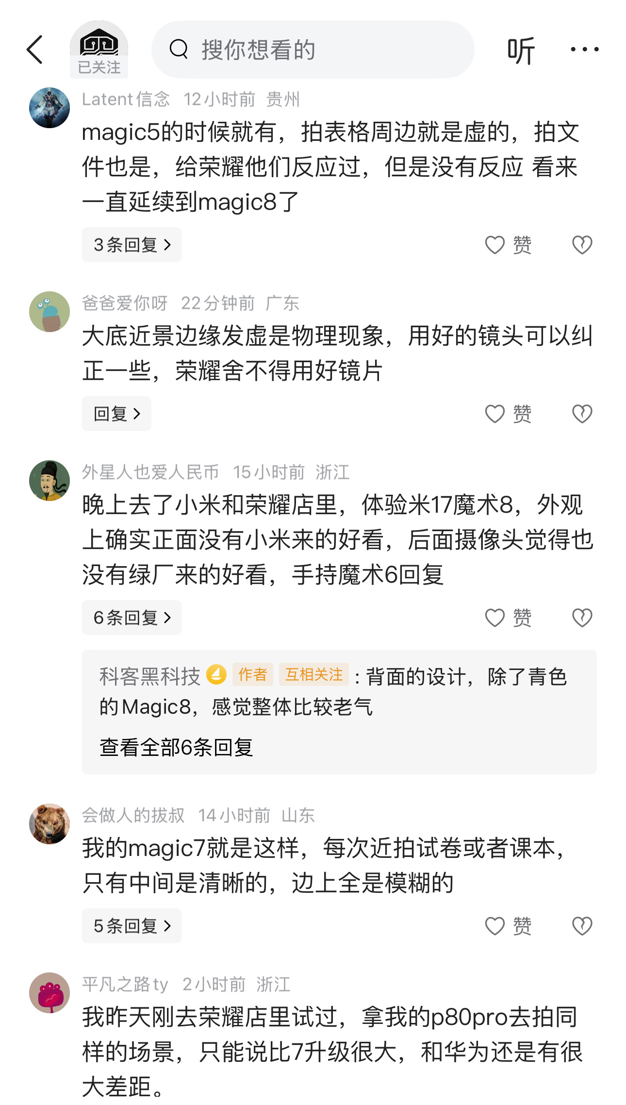 近距离把画面细节拍清晰,难道是很难的事情吗?不少千元手机都能胜任的事,荣耀Magic8系列作为旗舰机反而处理不好基础的需求,讲真让人难以理解。事实上,在各类平台刷到过不少用户反馈荣耀旗舰手机近拍不清晰、边缘模糊的问题,荣耀似乎一直未做出改善。是不重视、听不进去用户和网友的评价吗?还是说荣耀影像技不如人?