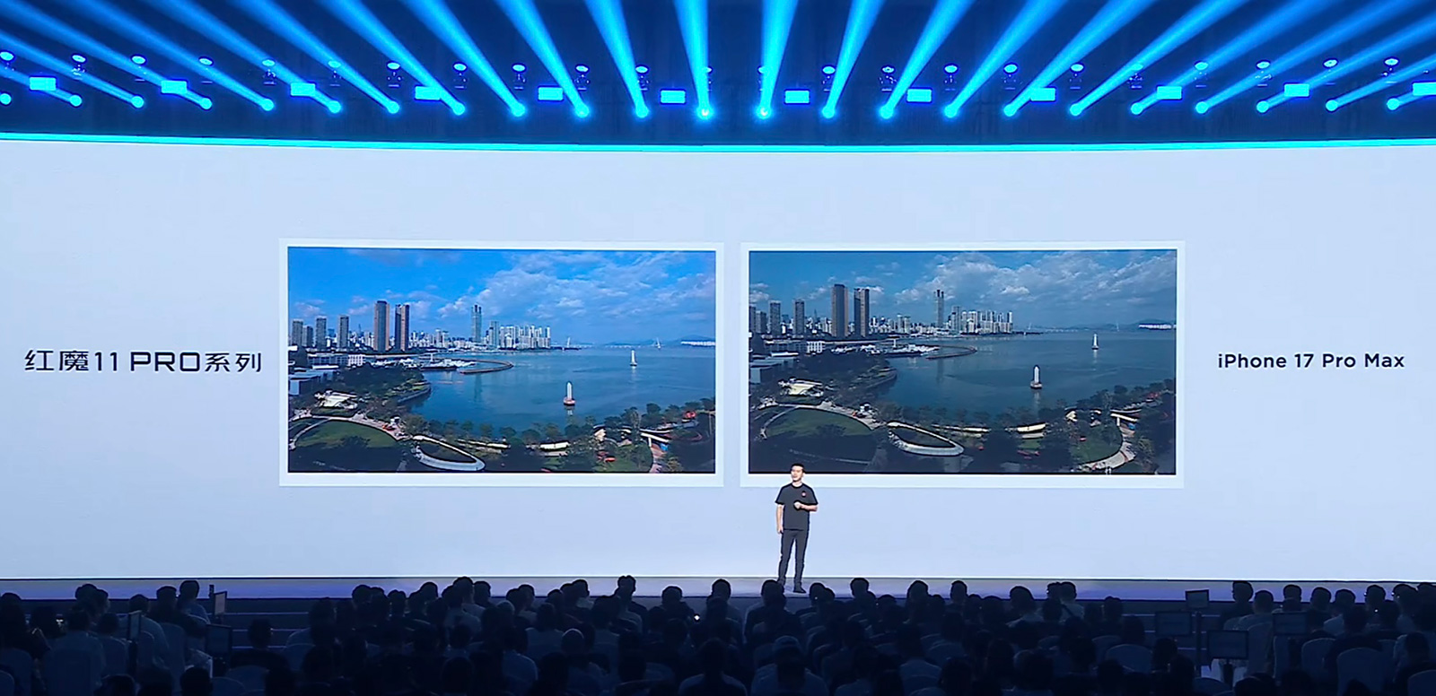 红魔11 Pro系列还首次在红魔游戏手机中增加长焦摄像头,不过只是较为普通的直立式长焦,夜拍水准比不上潜望式长焦。红魔发布会上专门拿苹果iPhone 17 Pro Max对比拍照效果,称“苹果给的是原材料,红魔是社交级的成片”。