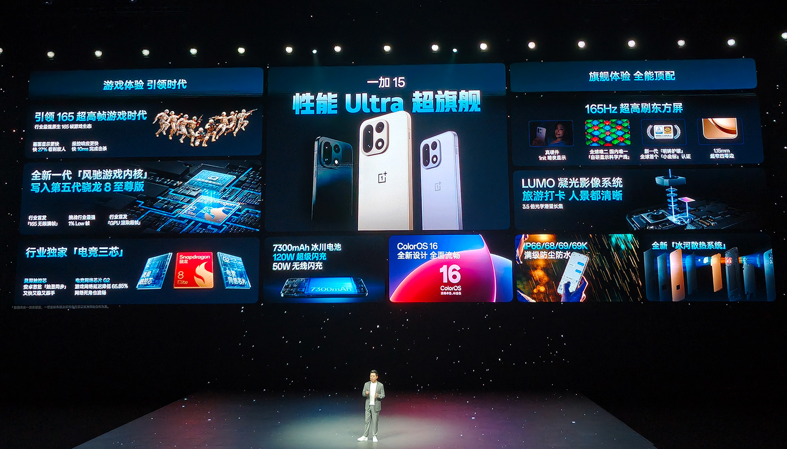 7300mAh电池(双电芯)、120W有线闪充、50W无线闪充,李杰表示一加15的这套充电续航组合是“史上最豪华”,40分钟不到即能充电至100%,15分钟可充至50%,满帧游戏畅玩9小时,刷短视频续航长达19小时。