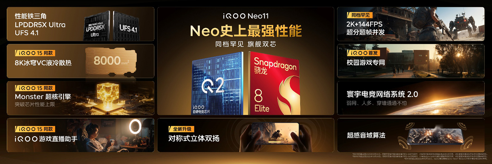 iQOO Neo11 搭载由骁龙 8 至尊版与自研电竞芯片 Q2 组成的“旗舰电竞双芯”,并在 Monster 超核引擎支撑下,带来优秀的 1% Low 帧表现、全新升级的 PC 级 2K 纹理超分、原生级 144FPS 无损超帧以及超分超帧并发,实现行业领先的游戏视效;更以 8K 冰穹 VC 液冷散热、7500mAh 超薄蓝海电池、AR 增透膜等多项 iQOO 15 同款配置、高质感金属玻璃机身和 IP68 & IP69 防尘防水等,共筑一款更优秀的强悍标准版。
