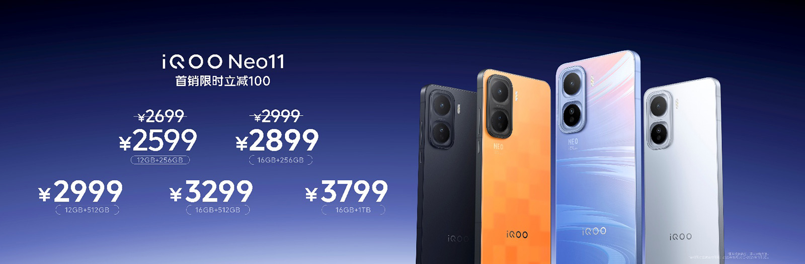 iQOO Neo11 共有 5 个版本可供选择,12GB+256GB 版本售价 2699 元(首销限时到手 2599 元);16GB+256GB 版本售价 2999 元(首销限时到手 2899 元);12GB+512GB 版本售价 2999 元;16GB+512GB 版本售价 3299 元;16GB+1TB 版本售价 3799 元,即刻下单,享更多权益。添加科客公众号kekebat,获取更多精彩资讯。