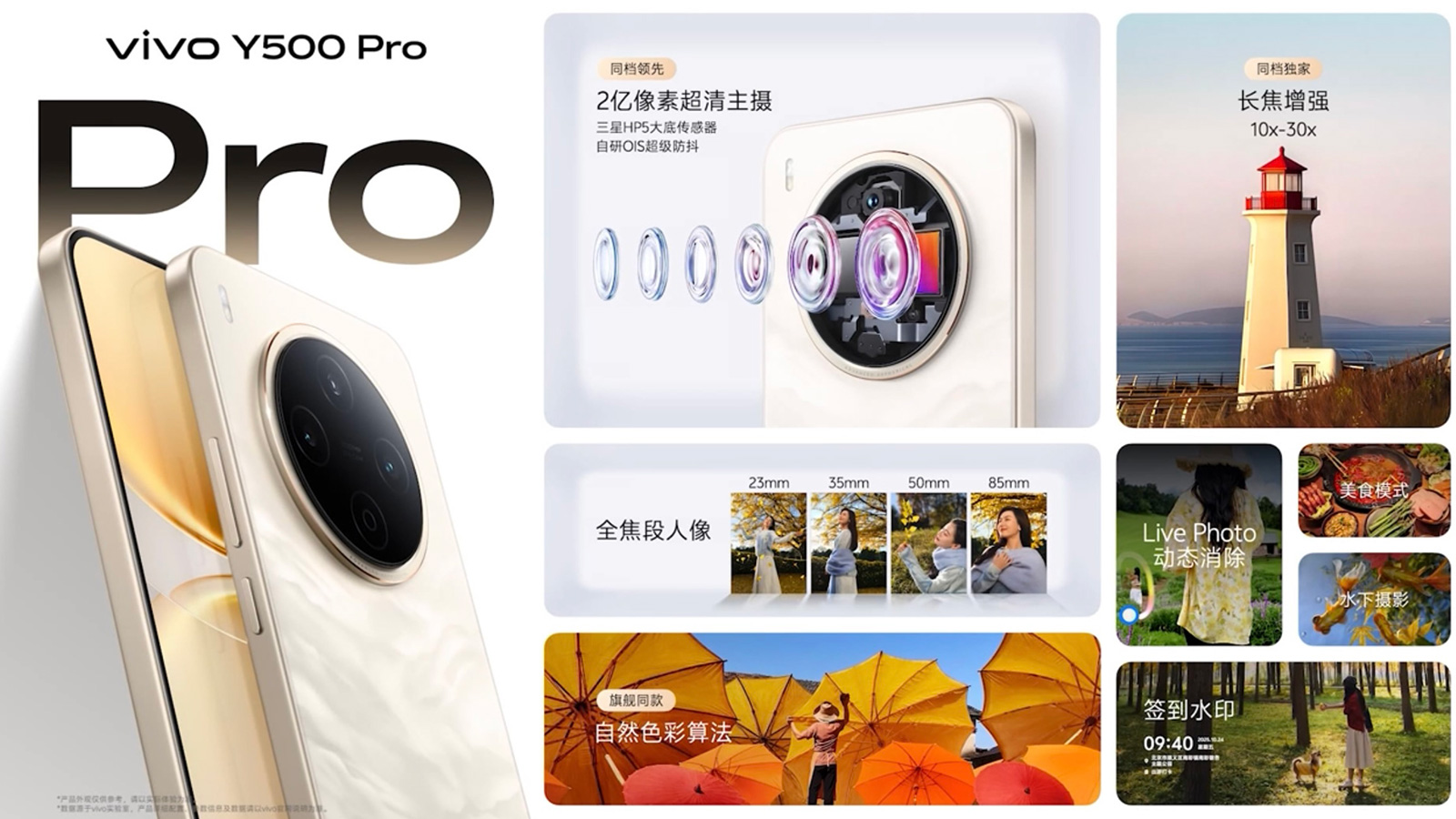 vivo Y500 Pro拥有2亿像素主摄,起步价1799元起的机型,定位“国民小旗舰”。