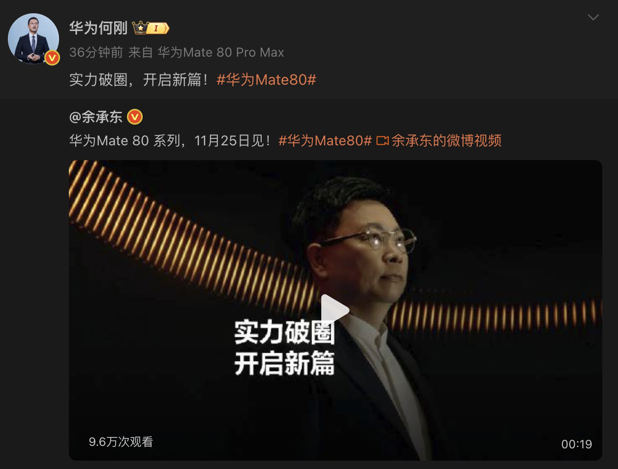 值得一提的是,11月17日华为终端BG董事长余承东和华为终端BG首席执行官何刚均使用新机发了微博,小尾巴显示“华为Mate 80 Pro Max”,这款机型应该是此前Mate系列Pro+或RS机型的改名,可能会采用6.9英寸甚至更大的直屏。华为曾在2015年推出的华为P8系列中使用过P8 Max机型命名,全新的Mate 80 Pro Max或许也有致敬10年经典机型的特殊含义。