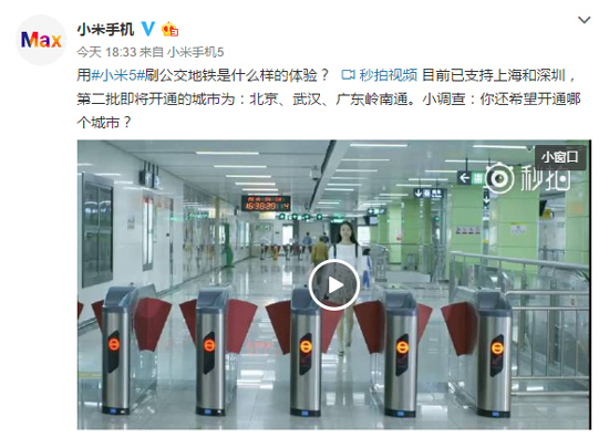 效率有点高 小米公交卡再增北京、武汉、广东三城市