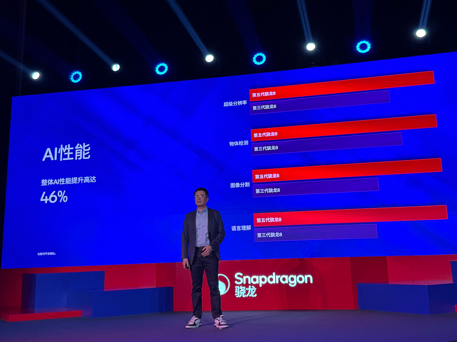 图形性能方面,第五代骁龙8搭载的Adreno GPU相比上代产品,性能提升11%,功耗领先28%。另外,第五代骁龙8的整体AI性能大涨46%。