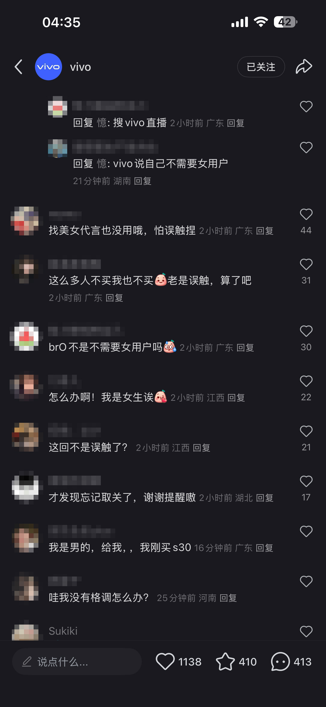11月29日晚vivo直播间涌入大量评论,主播将颇具争议的言论置顶,引发许多网友不满。12月1日晚,vivo针对此事专门在微博发帖还原事件经过并致歉。vivo称直播间置顶评论为“主播在突发状况的慌乱中不慎误触”,“不代表vivo立场”。此次风波之后,“误触”、“不需要女用户”等词句成为部分网友调侃vivo的口头禅。