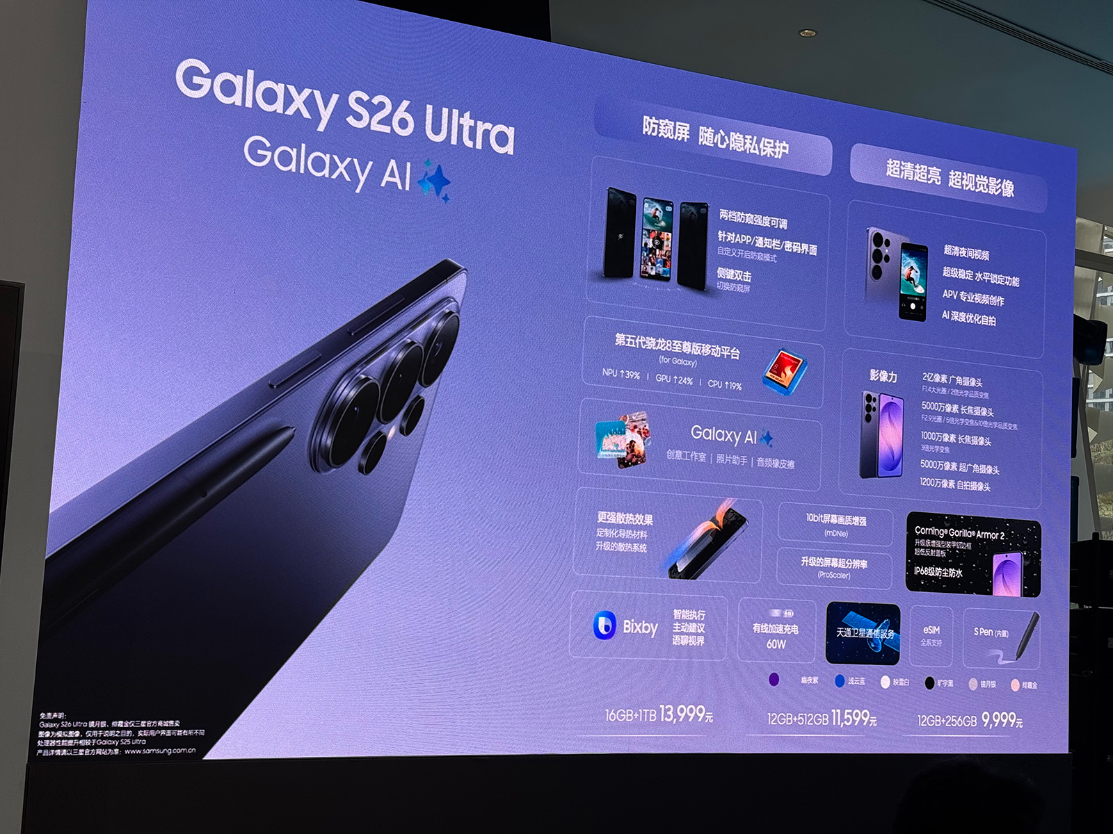 首款搭载防窥显示屏的机型三星Galaxy S26 Ultra已于2月26日正式发布,国行版零售价9999元起。