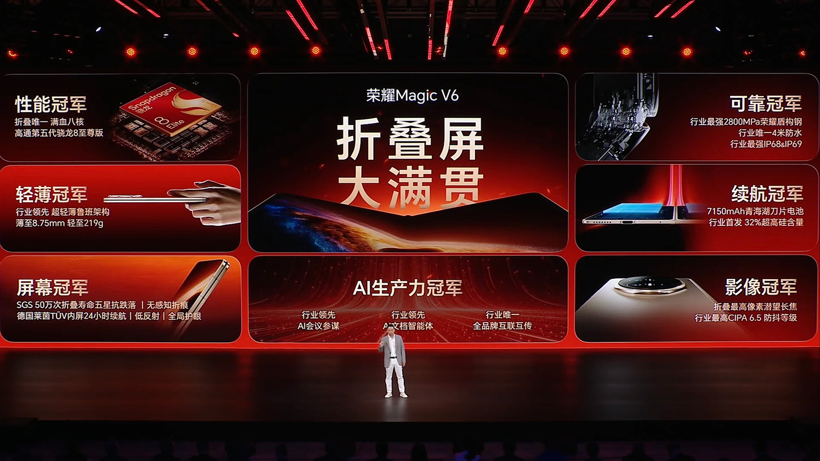 荣耀正式在国内市场推出新一代折叠屏旗舰荣耀Magic V6,号称“折叠屏大满贯”。