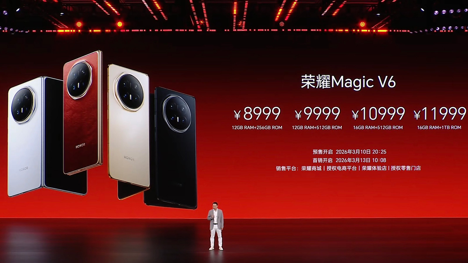 3月10日晚,荣耀在深圳举办新品发布会,正式在国内市场推出新一代折叠屏旗舰荣耀Magic V6,号称“折叠屏大满贯”,是艺人谢霆锋、米兰冬奥冠军夫妻徐梦桃和王心迪同款。荣耀Magic V6的16GB内存版本价格相比上代机型上涨1000元,电池容量相比海外版有小幅度增加。