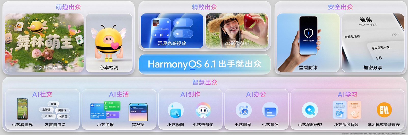 此外,HUAWEI Pura 90系列全面升级HarmonyOS 6.1,全新舞林萌主视觉形象更多样,拟人感互动全局陪伴更有温度;心率检测可检测用户心跳,给出差异化动效反馈,解锁新奇交互体验。全新小艺智慧再升级,小艺看世界、小艺时光机等功能实用有趣。隐私安全方面,星盾防诈可一键开启多场景智能防护,更支持将电诈风险及时同步给家人。